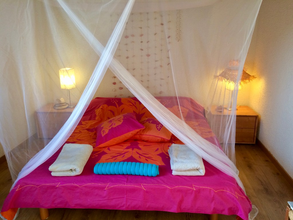 . La chambre avec vue est belle, elle est équipée d’un lit 200 x 160 cm, de deux commodes, d’une armoire et d’une très grande moustiquaire sur cadre pour plus de confort.
