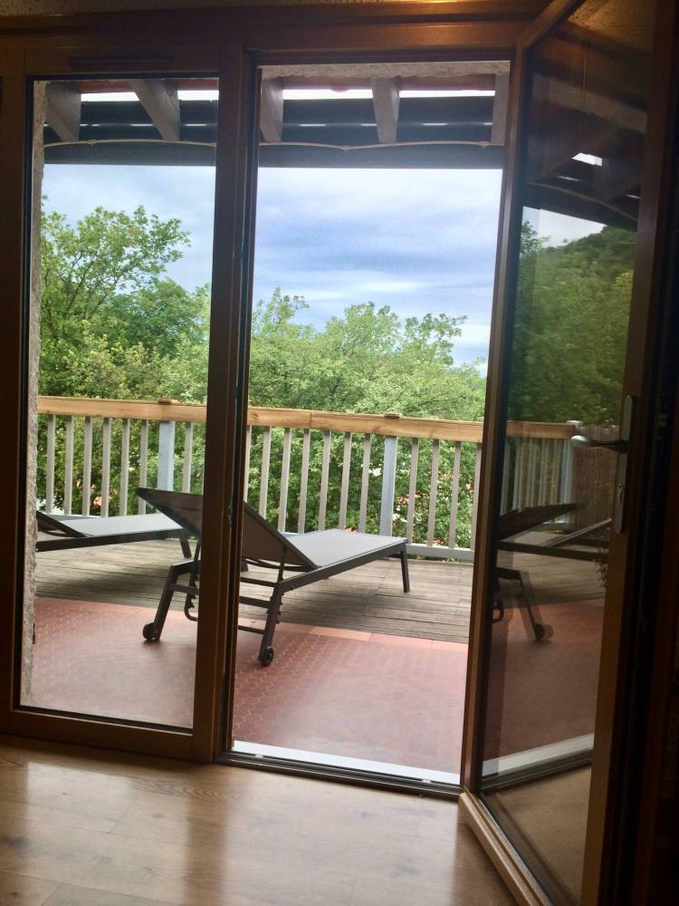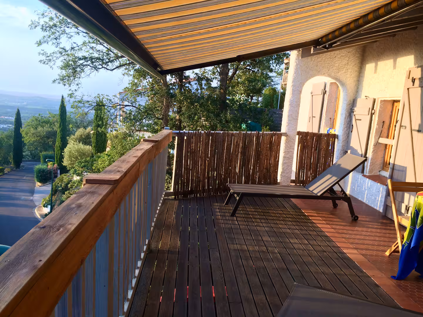 . La terrasse est équipée d’un grand store, d’une petite table ronde en bois et ses deux chaises, de deux fauteuils. NOUVEAU : Et vous trouverez aussi 2 nouvelles chaises longues.