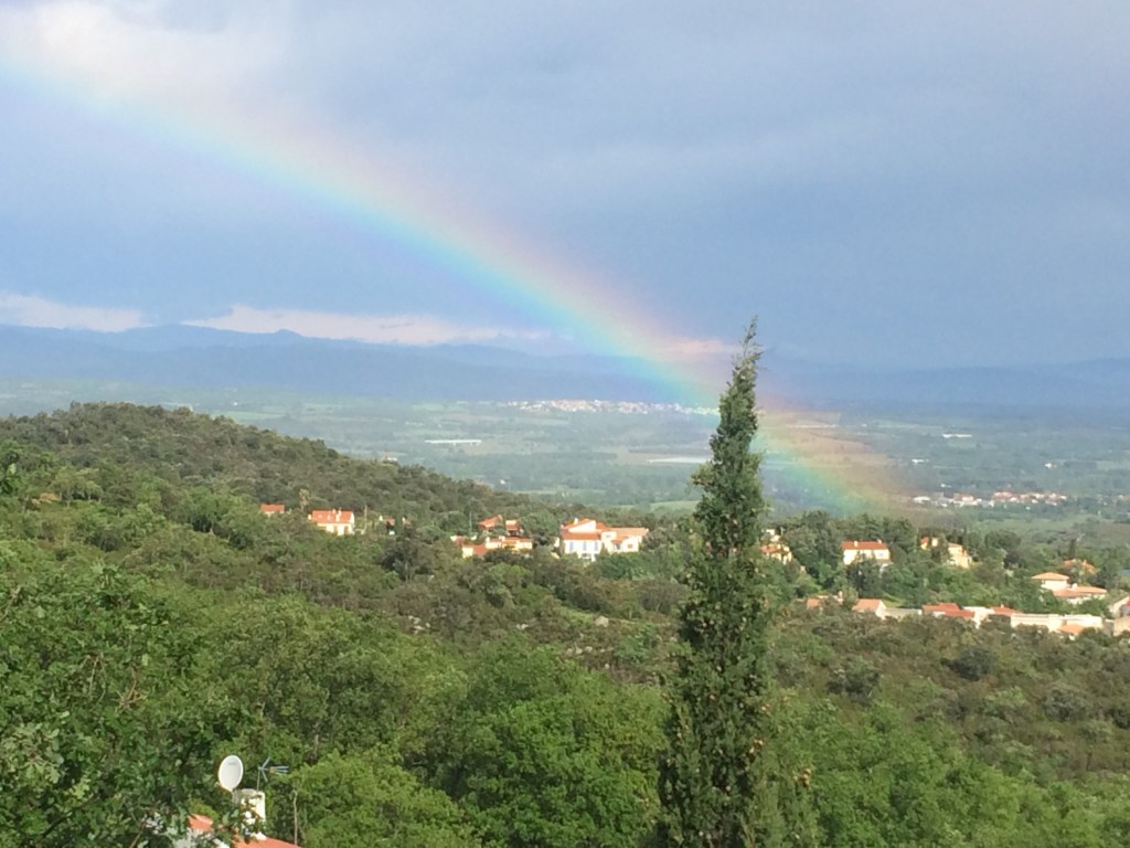 La vue depuis la terrasse en bois et un arc en ciel de printemps …
